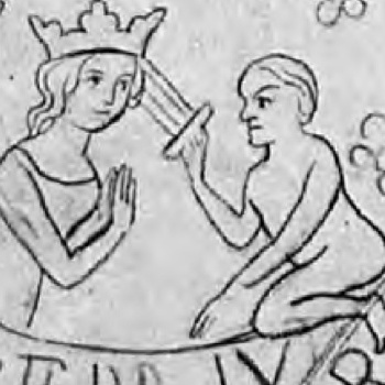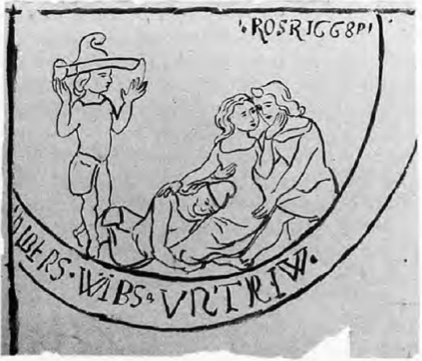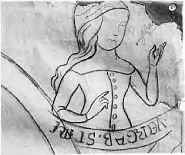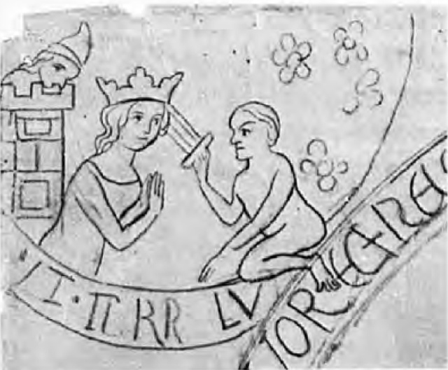 Auf einem Medaillon, das sich neben dem von David und Batseba befunden haben soll, waren laut Mone eine nackte Königin und zwei andere Figuren zu sehen, von denen die eine die andere mit einer Rute schlägt. Wunderlich ergänzt hier die Umschrift SITTE DICH NU REW (Wunderlich, S. 138).