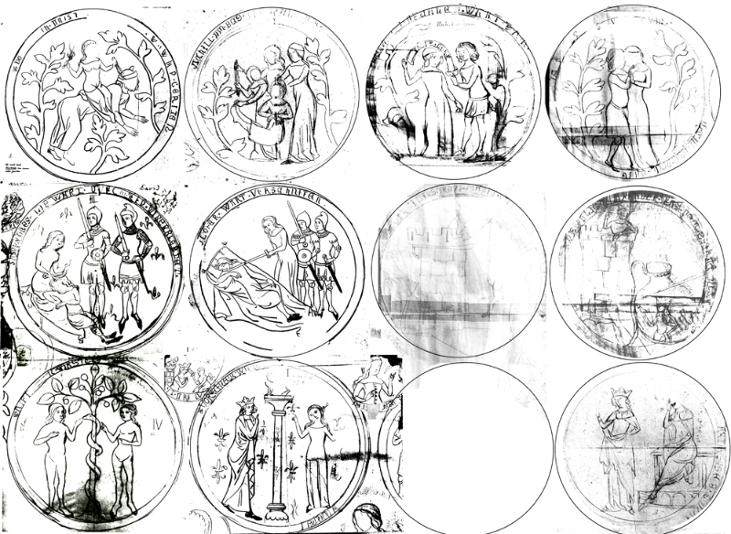 Der Zyklus der Minnesklaven bestand aus mindestens 12 großen Medaillons, zwischen denen noch weitere, kleinere Figuren und Nebenszenen platziert waren. Nicht alle Elemente sind in Nachzeichnungen überliefert, ebensowenig ist die ursprüngliche Anordnung der Hauptmedaillons klar festgehalten. Auch die nebenstehende Montage hat den Charakter einer Hypothese.Thema der Bilder sind ...