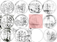 Links im Medaillon ist ein aus Steinen gemauerter Turm zu sehen. Darauf steht eine Gestalt, die eine Krone auf dem Kopf trägt und in der Hand einen Stock mit einem daran befestigten Seil wie eine Angel hält. Am unteren Ende des Seils ist ein Brett befestigt. Dort sitzt eine zweite Figur und schwebt über dem Boden. Am linken und rechten Bildrand des Medaillons befinden sich zwei große ... mehr anzeigenLinks im Medaillon ist ein aus Steinen gemauerter Turm zu sehen. Darauf steht eine Gestalt, die eine Krone auf dem Kopf trägt und in der Hand einen Stock mit einem daran befestigten Seil wie eine Angel hält. Am unteren Ende des Seils ist ein Brett befestigt. Dort sitzt eine zweite Figur und schwebt über dem Boden. Am linken und rechten Bildrand des Medaillons befinden sich zwei große Blattranken.