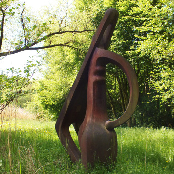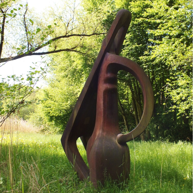 Der Titel, „Die heutige Situation“, den der Künstler seiner drei Meter hohen, aus Gusseisen realisierten Plastik gegeben hat, ist keine große Verständnishilfe. Das Werk verbindet zwei gegensätzlich geformte Gebilde: ein breit ausladendes, rundes und ein hochstrebendes, das zum Dünnen, Eckigen tendiert. Zusammen kann man sie als Paar, als Frau und Mann, interpretieren, muss es aber ... mehr anzeigenDer Titel, „Die heutige Situation“, den der Künstler seiner drei Meter hohen, aus Gusseisen realisierten Plastik gegeben hat, ist keine große Verständnishilfe. Das Werk verbindet zwei gegensätzlich geformte Gebilde: ein breit ausladendes, rundes und ein hochstrebendes, das zum Dünnen, Eckigen tendiert. Zusammen kann man sie als Paar, als Frau und Mann, interpretieren, muss es aber nicht. Unten sind die beiden Gebilde miteinander verschmolzen und im oberen Teil sind sie ineinander verschränkt.Die Plastik lebt von starken Gegensätzen der Gestaltung. So antwortet auf den schmalen, abgewinkelten Teil auf der Seite gegenüber ein auslandender runder Bogen, der in einer kleinen Kugel mündet und sich dabei wie ein Arm auf den gewölbten „Unterleib“ abstützt. Direkt unterhalb des „Achselhöhle“ erkennt man zwei Ausbuchtungen, die an eine weibliche Brust erinnern.Wer die Plastik als Darstellung eines Paars interpretieren will, wird vom Werk selbst immer wieder in die Schranken verwiesen. Die zur Abstraktion tendierende Gestaltung zwingt den Betrachter, die Formen in ihrer dynamischen Entwicklung als einen großen Zusammenhang, als komplexes Formereignis, wahrzunehmen.