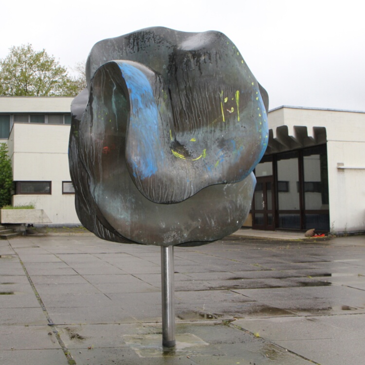 Die aus Sandguss hergestellte Freiplastik fußt auf einem Edelstahlrohr. Deshalb scheint sie, obwohl in sich kompakt und gedrängt, wie eine Wolke zu schweben. In ihrer komplexen, bewegten Form macht die Plastik einen Schaffensprozess sichtbar, der ohne Bezug auf eine äußere Vorlage in das Material hinein gearbeitet scheint. Es ist eine Zusammenballung von Windungen, Kurven und Senkungen, ... mehr anzeigenDie aus Sandguss hergestellte Freiplastik fußt auf einem Edelstahlrohr. Deshalb scheint sie, obwohl in sich kompakt und gedrängt, wie eine Wolke zu schweben. In ihrer komplexen, bewegten Form macht die Plastik einen Schaffensprozess sichtbar, der ohne Bezug auf eine äußere Vorlage in das Material hinein gearbeitet scheint. Es ist eine Zusammenballung von Windungen, Kurven und Senkungen, die die sichtbare Oberfläche durchziehen und beleben. Das ungegenständliche, nicht geometrische Werk zeugt von einem für die Strömung des Informel charakteristischen intuitiven Zugang zur Form.Emil Cimiotti, 1927 in Göttingen geboren, gehört zu den Künstlern des Informel und der abstrakten Kunst nach 1950. Nach einer dreijährigen Lehre zum Steinmetz absolviert Cimiotti das Studium der Bildhauerei bei Otto Baum an der Kunsthochschule Stuttgart. Zunächst von der Kritik abgelehnt, erhält er 1957 die Auszeichnung „junger westen 57“ und kann sich als Künstler etablieren. 1963 wird Emil Cimiotti Mitbegründer der Kunsthochschule Braunschweig, an der er bis 1992 unterrichtet. Seit 1994 war er Mitglied der Akademie der Bildenden Künste Berlin-Brandenburg. Bis zu seinem Tod im Jahr 2019 lebte Cimiotti in Wolfenbüttel und arbeitete in seinem Atelier in Hedwigsburg. weniger anzeigen