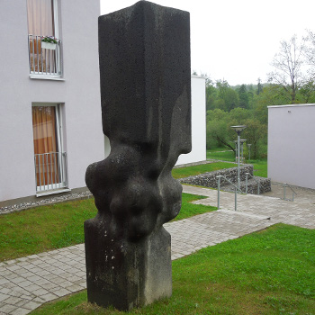 Als Rohform für die Skulptur diente dem Bildhauer ein über zwei Meter hoher Pfeiler mit quadratischem Grundriss aus schwarzem Lavastein. Durch die Bearbeitung ist der Pfeiler in drei Teile gegliedert. Im unteren Teile ist er durch eine besonders bearbeitete Zone unterbrochen. Diese hebt sich durch ihre unregelmäßig angeordneten, organisch wirkenden Rundungen von der geometrischen ... mehr anzeigenAls Rohform für die Skulptur diente dem Bildhauer ein über zwei Meter hoher Pfeiler mit quadratischem Grundriss aus schwarzem Lavastein. Durch die Bearbeitung ist der Pfeiler in drei Teile gegliedert. Im unteren Teile ist er durch eine besonders bearbeitete Zone unterbrochen. Diese hebt sich durch ihre unregelmäßig angeordneten, organisch wirkenden Rundungen von der geometrischen Grundform deutlich ab. Die frei gestaltete Zwischenzone wirkt wie ein Gelenk, an das der obere, längere Teil des Pfeilers angefügt ist. Dadurch, dass der obere Pfeilerteil gegenüber dem unteren seitlich leicht verschoben und höher angesetzt ist, wirkt die Skulptur, trotz ihrer abstrakten Gestaltung, in ihrer Gesamterscheinung dynamisch und lebendig.
