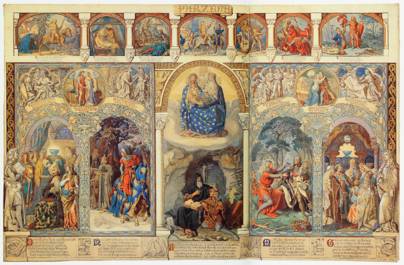 Auch wenn Parzival im Konstanzer Fresko auf den ersten Blick nur weltliche Abenteuer besteht, so geschieht das im Verständnis des frühen 14. Jahrhunderts, das den tugendhaften Ritter und seine Heldentaten in einen größeren, heilsgeschichtlichen Zusammenhang stellt. So hat Norman Ächtler (2007, S. 294) gezeigt, dass die Parzival-Geschichte, wie sie an der Wand im Haus zur Kunkel ... mehr anzeigenAuch wenn Parzival im Konstanzer Fresko auf den ersten Blick nur weltliche Abenteuer besteht, so geschieht das im Verständnis des frühen 14. Jahrhunderts, das den tugendhaften Ritter und seine Heldentaten in einen größeren, heilsgeschichtlichen Zusammenhang stellt. So hat Norman Ächtler (2007, S. 294) gezeigt, dass die Parzival-Geschichte, wie sie an der Wand im Haus zur Kunkel ‚erzählt‘ wird, auffallend der klassischen Form der Lebensgeschichten von Heiligen, den sogenannten Heiligenviten, entspricht. In diesen deutet sich die ‚Auserwähltheit‘ eines späteren Heiligen meist in einer ungewöhnlichen Geburt (laut Wolfram war Parzival ein riesiger Säugling) an. Später weisen dann ‚Helfer‘ (hier Gurnemanz, Condwiramurs und Sigune) dem noch Sündigen den rechten Weg. Sobald dieser dann eine innere Läuterung durchlaufen hat und sich zur Nachfolge Christi aufmacht, wird dies mit einer Veränderung des Äußeren veranschaulicht (Parzival wird mehrmals neu eingekleidet). Nach einem Martyrium wird der gottgefällige Mensch schließlich zum Heiligen, wodurch die Imitatio Christi vollends vollzogen ist. Für Wolframs Parzival besteht das Martyrium – welches allerdings im Konstanzer Wandgemälde ausgespart ist – aus abgründigstem Hadern mit Gott, das er erst überwinden muss, bevor er im Epos Gralskönig werden kann.Auch einige Motive des Parzival-Wandgemäldes lassen sich kaum losgelöst von ihrer christlich ikonographischen Tradition betrachten. So spielt die Geburt des Parzival – besonders mit der entsprechenden Romanstelle im Hinterkopf, welche die Königin direkt mit der regina coeli vergleicht – auf die Geburt Christi und zugleich auf die Geburt Johannes’ des Täufers an (Saurma 2002, S. 308). Auch die Tischszenen konnten in den Augen eines mittelalterlichen Betrachters stets Verweise auf das letzte Abendmahl generieren.Wer das Parzival-Fresko systematisch nach Bezügen zur christologischen Ikonographie durchsucht, findet manche Anspielungen sogar in der richtigen Reihenfolge: Von Weihnachten (Parzivals Geburt) und dem Einzug in Jerusalem (das "pfärdelîn") über das letzte Abendmahl (Tischszene) und der Pietà (Sigune) bis hin zum sehr wahrscheinlich ursprünglich abgebildeten, quasi-himmlischen Thron der Gralstafel. weniger anzeigen