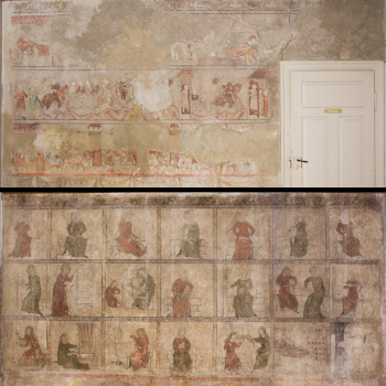 Eine weitere christliche Interpretation zum Parzivalzyklus bietet Lieselott E. Saurma-Jeltsch an, die in ihm das Ideal der vita activa verbildlicht sieht. Als eine von zwei gottgefälligen Lebensformen verlangt die vita activa von Christen ein aktives Wirken in der Welt im Sinne der Nächstenliebe. Im ergänzenden Kontrast dazu steht in der mönchischen Tradition mit der vita contemplativa ... mehr anzeigenEine weitere christliche Interpretation zum Parzivalzyklus bietet Lieselott E. Saurma-Jeltsch an, die in ihm das Ideal der vita activa verbildlicht sieht. Als eine von zwei gottgefälligen Lebensformen verlangt die vita activa von Christen ein aktives Wirken in der Welt im Sinne der Nächstenliebe. Im ergänzenden Kontrast dazu steht in der mönchischen Tradition mit der vita contemplativa eine zurückgezogene Lebensführung, die im Gebet und in meditierender Beschäftigung Gott sucht. Für Saurma-Jeltsch ist in den Weberinnen-Fresken "über die Bearbeitung der Materie die Arbeit im Geiste, [...] der Einstieg in die vita contemplativa, visualisiert" (Saurma 2002, S. 307). Auch formal entsprechen die statisch abgegrenzten Bildfelder der Weberinnen und das dynamische Ineinandergreifen der Parzivalepisoden dieser Sichtweise. Zwischen den beiden Wandmalereien eröffnet sich bei dieser Interpretation ein Raum, der sich in heilsgeschichtliche Traditionen einschreibt und zugleich individuell die Frage nach dem richtigen Leben aufwirft. weniger anzeigen