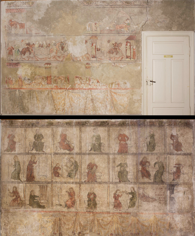 Auch wenn die formale Grundanlage der gegenüberliegenden Weberinnen- und Parzivalfresken die gleiche ist, so wird doch selbst beim schlechten heutigen Erhaltungszustand klar, dass die klar abgegrenzten Bildfelder der Weberinnen – bei allem dargestellten Fleiß und Liebreiz – eher statisch wirken (fast wie Statuetten in einzelnen Regalfächern), während die ineinandergreifenden Episoden der Parzivalwand ein viel dynamischeres Gesamtbild abgeben.