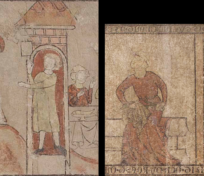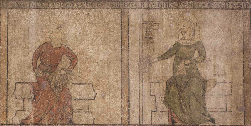 Einmal auf die Spur solcher Auslegungen gesetzt, sei hier kurz eine letzte übergreifende Beobachtung erlaubt. Das zentrale Bildfeld der Weberinnen zeigt eine rot(!) gekleidete Frau, die direkt über ihrem Schoß Stoff zerschneidet. Ihr direkt gegenüber in der Mitte des Parzivalfreskos ist Parzival zu sehen: auf dem Tisch liegt ein Fisch, der sich planimetrisch betrachtet auf der Höhe seines Geschlechts befindet – und das in einer Episode, in der er im Roman ausdrücklich entkleidet und in all seiner Jünglingspracht von jungen Mägden gebadet wird. Geht es da zu weit, beim Fisch an Ichthyo-Phallik, beim zerschnittenen Stoff im Schoß an das durchstoßene hymen zu denken? Lässt man diese Gedanken zu, so kommt es in der Mitte des Raumes, sozusagen im Geist des Betrachters zum hieros gamos von vita activa und vita contemplativa. Dass dies durchaus ein fruchtbarer Gedanke sein kann, zeigt die nächste Weberin in der Abfolge: sie sitzt mit auffallend dickem, vorgestrecktem Bauch da und fertigt stolz ‚Täschlein‘. Ein "tumber Tor", wer Böses dabei denkt? weniger anzeigen