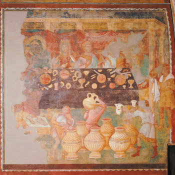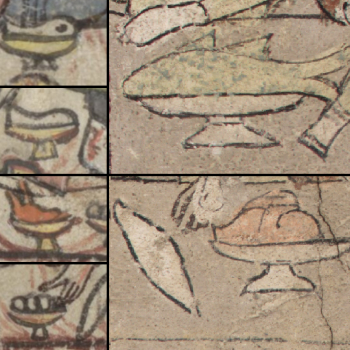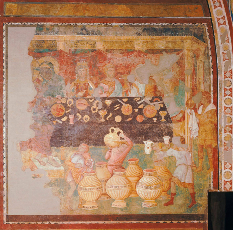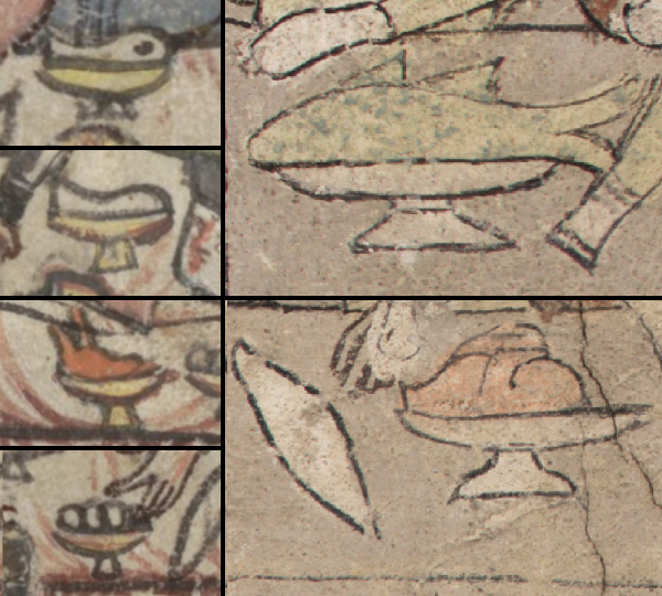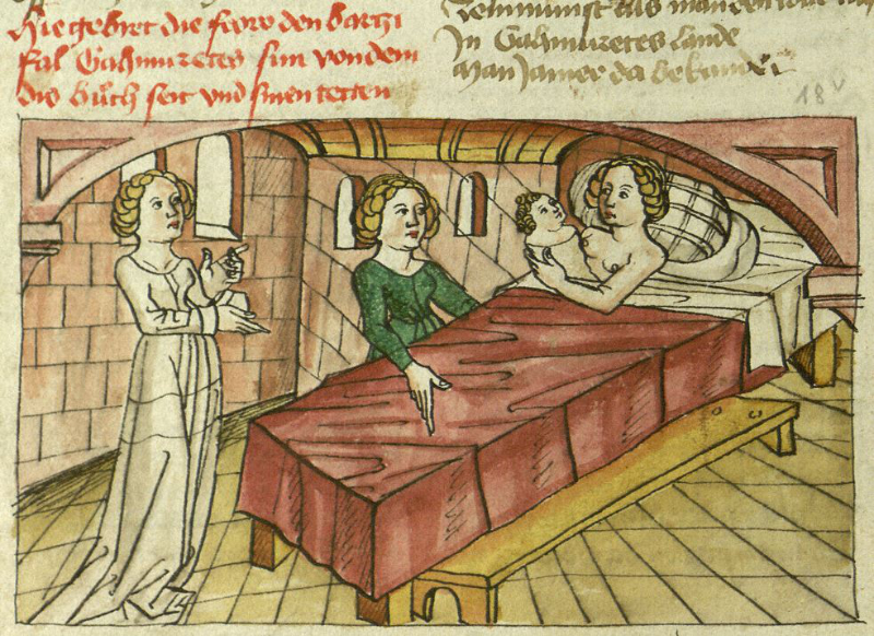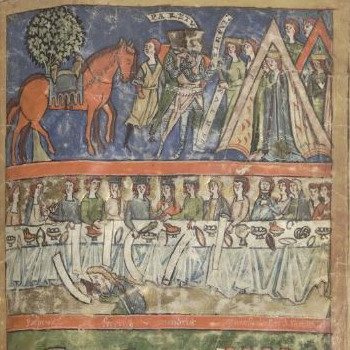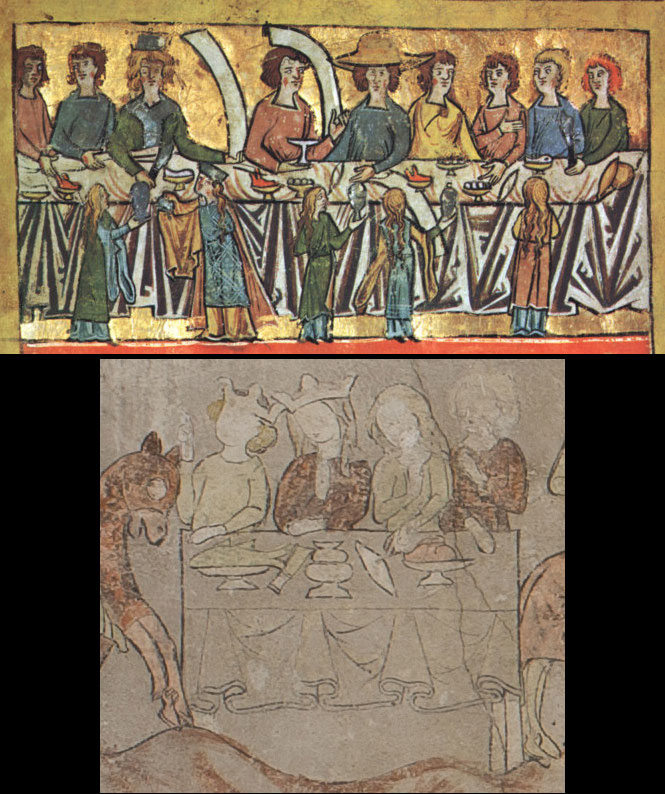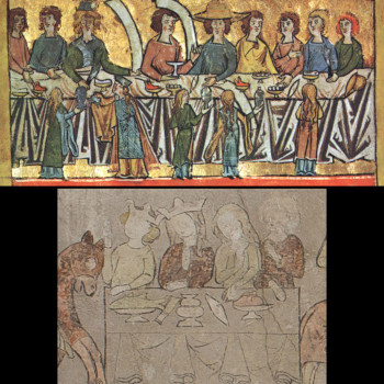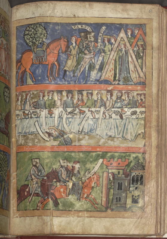 Doch vor allem fallen Unterschiede auf: die breit angelegte Festtafel ist auf einen schmalen Tisch reduziert. Während die Handschrift Diener vor dem Tisch platziert, sieht sich der Betrachter in der räumlich reduzierteren Szene in Konstanz viel direkter mit den Personen am Tisch konfrontiert. Ein interessantes Detail sind die Schriftbänder, die in der Handschrift die Namen einiger abgebildeter Personen aufnehmen sollten (Abb. 1 oberer und unterer Bildstreifen). Dem Illustrator war es offenbar ein Anliegen, den Bezug zum Text deutlich zu machen und dem Leser zu helfen, die Figuren zu identifizieren. In Konstanz fehlen die Namensbänder und damit auch der deutliche Rückbezug auf den Text.