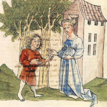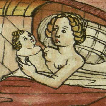 Die späteren Handschriften aus dem 14. und 15. Jahrhundert weisen eine stärker perspektivierte Räumlichkeit auf und geben dem Betrachter Einblick in Innenräume (Abb. 5 und 6). Schon der Konstanzer Zyklus zeigt in den Szenen, in denen Parzival Frauen begegnet, Ansätze zur Darstellungstechnik einer zum Betrachter hin fehlenden "vierten Wand". weniger anzeigen