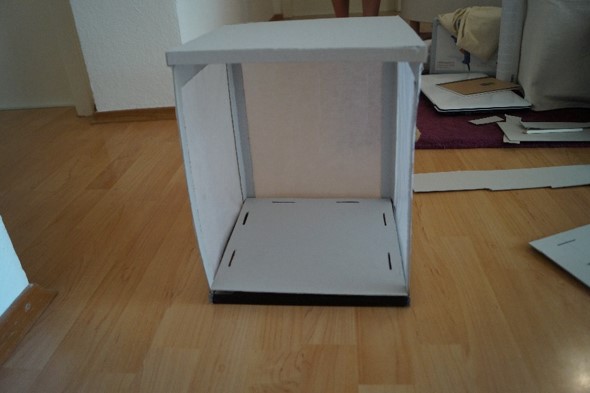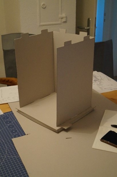 Diese drei Seiten sollten die Konstante bilden, während die vierte Seite das mobile, herausnehmbare Element darstellt, um in das Innere blicken zu können. Die Hartpappe ist bewusst gewählt, um die Farbigkeit des Sichtbetons nachzuempfinden.