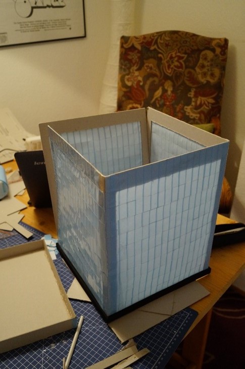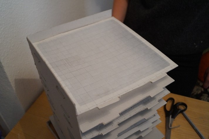 Mittels der zuvor ausgewählten Stecktechnik werden nach und nach die einzelnen Boden- und Deckenelemente im Modell angebracht. Die Detailgenauigkeit ist hierbei entscheidend. Wie im Kunsthaus Bregenz werden die Zwischendenken aus Glas, aus exakt 253 einzelnen Tafeln pro Stockwerk, nachvollzogen, um den indirekten Lichteinfall zu ermöglichen.