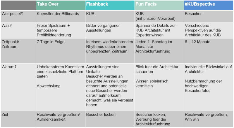Unter dem Vorschlag ‚Take Over‘ versteht sich die Idee, den Künstlern der vom KUB entwickelten Billboards (Verlinkung) über einen gewissen Zeitraum die Inhalte des Instagram-Profils zu überlassen, ihnen zum einen eine zusätzliche Plattform zu bieten, eine sequentielle Abwechslung zu schaffen und zum anderen durch die erhoffte Aufmerksamkeit möglicherweise auch die Reichweite zu vergrößern.