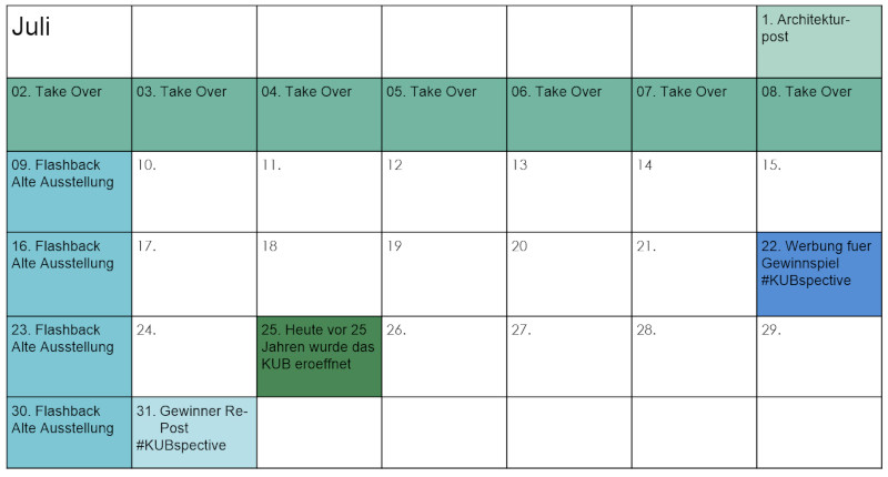 Hier sehen Sie einen Vorschlag der drei Studentinnen, wie ein möglicher Redaktionsplan, hier für den Monat Juli als Beispiel, aussehen könnte. So ein Redaktionsplan ist gerade unter „Instagramern“ keine Seltenheit mehr. Er hilft sowohl dem eigenen Account-Nutzer sein Profil zu strukturieren, über sämtliche Serien und Vorhaben den Überblick zu behalten als auch dem Profil-Besucher, der sich auf routinierte Beiträge verlassen kann.