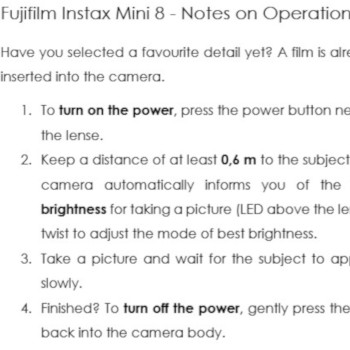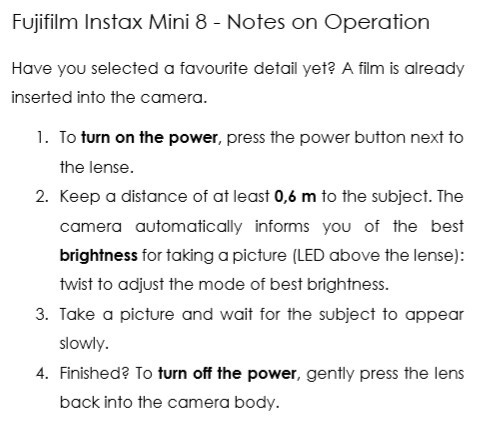 Um den Besucher mit einer Polaroid-Kamera vertraut zu machen und ihn einzuweisen, wurde ein Erklärungszettel angefertigt, der einmal auf Deutsch und wie hier abgebildet auf Englisch in einem DIN A5 Format erläutert, wie die Kamera zu bedienen ist.