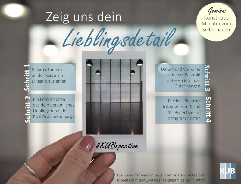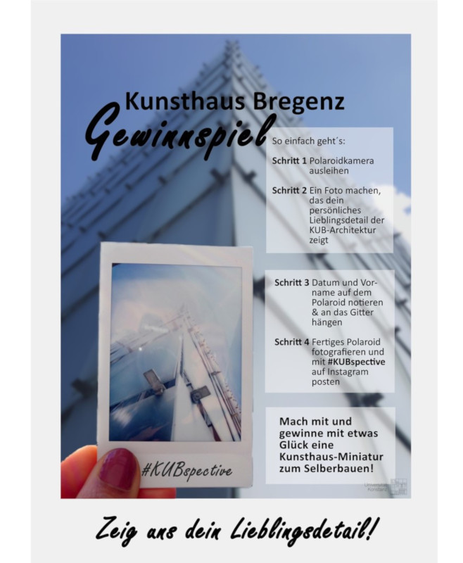 Um das Konzept der Polaroid-Fotos mit dem Instagram-Konzept zu verknüpfen, entstand die Idee, aus der Aktion ein Gewinnspiel zu kreieren und als Gewinn ein Miniaturmodell des KUBs (das der Modellbaugruppe) zu verlosen.