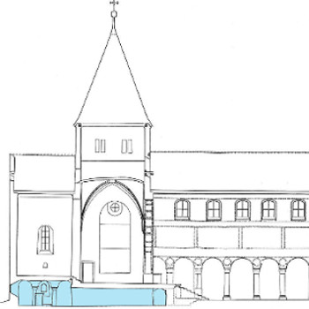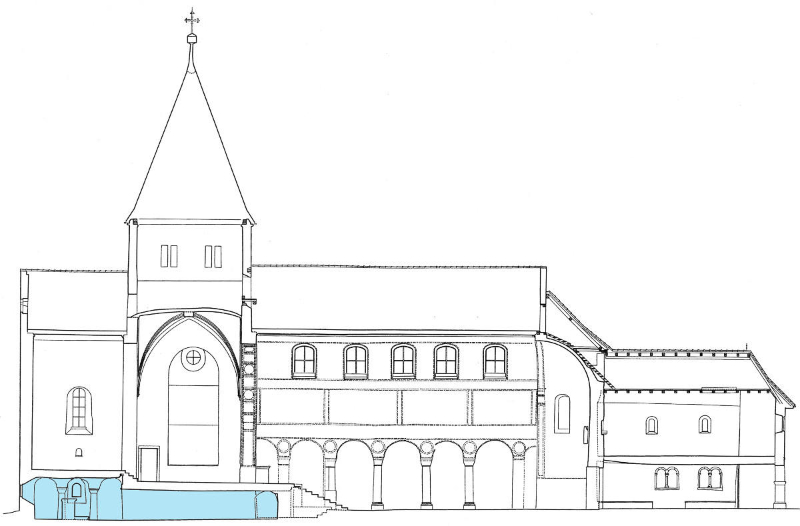 Der Aufriss zeigt den Aufbau der Kirche: unterhalb des Chores befindet sich in einem gedrungenen Untergeschoss die Krypta für die Reliquien.