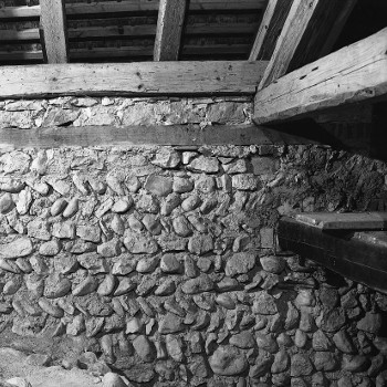 Im Bereich des Dachstuhls sieht man den unverputzten Ährenverband von Wackensteinen: Mit einfachen Mitteln werden die überlieferten Formen christlicher Baukunst reproduziert.