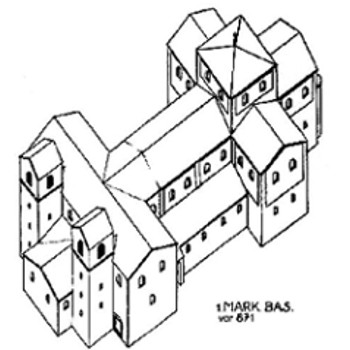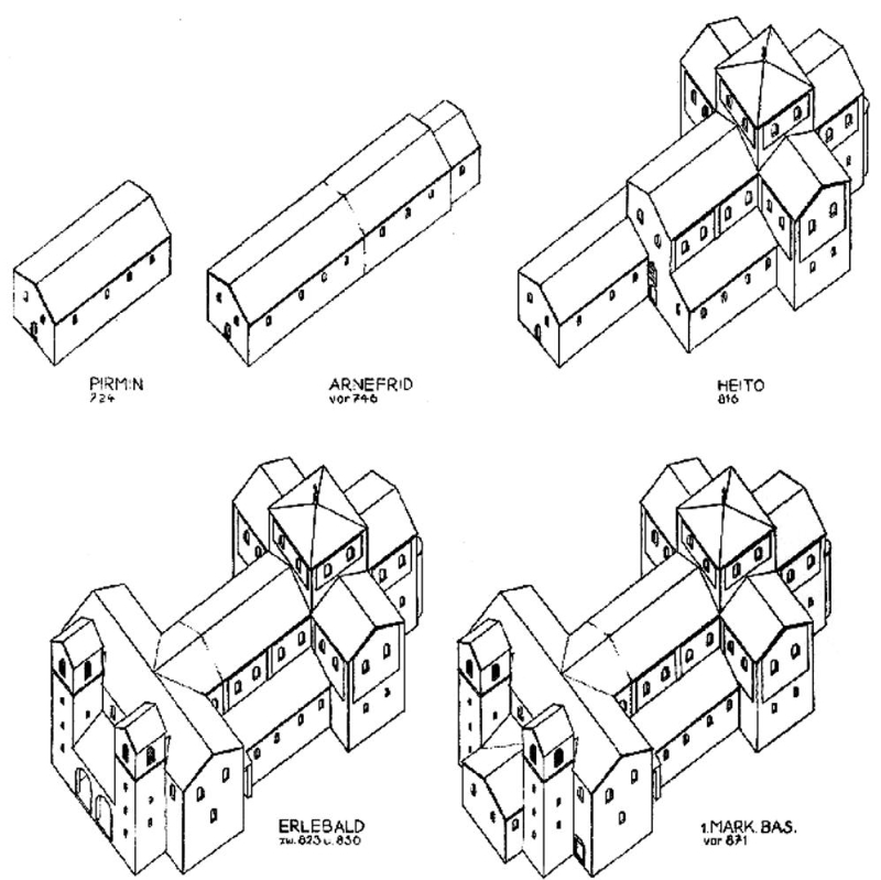 • Als die Kirche in Oberzell gebaut wurde, war die große Klosterkirche in Mittelzell bereits mehrfach erweitert worden, wie diese Rekonstruktion von Erdmann zeigt.