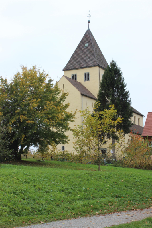 Auf der von Wasser umgebenen Insel wird im 9. Jahrhundert ein geschützter Klosterbezirk eingerichtet. 813 wird die erste große Klosterkirche in Mittelzell geweiht. Nach und nach wird die Insel mit weiteren Mönchszellen und Kirchen bestückt. 896 erhält Abt Hatto III, zugleich Erzbischof von Mainz, aus den Händen des Papstes eine Reliquie des hl. Georg. Hierfür wird die Kirche in ... mehr anzeigenAuf der von Wasser umgebenen Insel wird im 9. Jahrhundert ein geschützter Klosterbezirk eingerichtet. 813 wird die erste große Klosterkirche in Mittelzell geweiht. Nach und nach wird die Insel mit weiteren Mönchszellen und Kirchen bestückt. 896 erhält Abt Hatto III, zugleich Erzbischof von Mainz, aus den Händen des Papstes eine Reliquie des hl. Georg. Hierfür wird die Kirche in Oberzell gebaut. Die klare Grundform der Basilika mit den niedrigen Seitenschiffen und einem Vierungsturm ist durch das Aufschichten von meist unbehauenen Wackensteinen entstanden. Jeder Stein vollzieht sozusagen im Kleinen die Verwandlung der Bodenseewelt in einen gut organisierten Klosterbezirk. weniger anzeigen