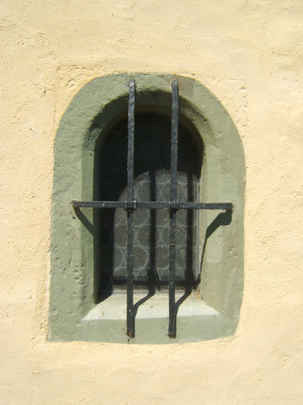 Blickt man durch das Ostfenster in die Krypta, kann man trotz der dunkel getönten Glasscheiben den Innenraum ausmachen.