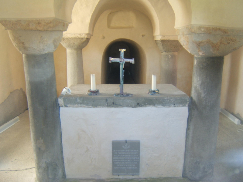 Der Blick fällt auf einen Altar. Im Hintergrund erkennt man das zugemauerte sepulcrum über dem Zugangsstollen. Es diente ursprünglich zur Aufbewahrung der Hauptreliquie und war für einen Zugriff von oben aus dem Chorraum und von unten aus der Krypta ausgebaut.