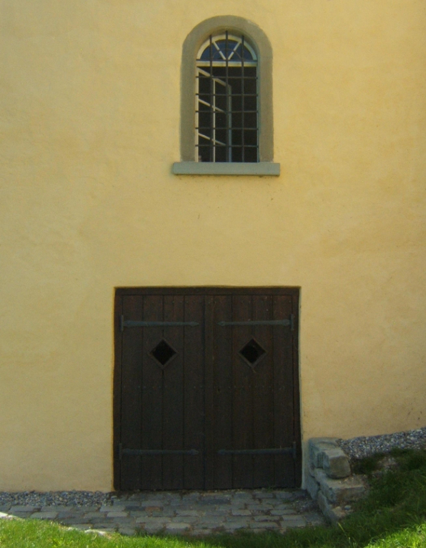 Hinter den kleinen Fenstern der östlichen Sockelwände befinden sich Kellerräume. Die eigenartige Positionierung der Fenster ist das Ergebnis von Umbauten im Inneren.Die beiden östlichen Fenster befinden sich auf einer Linie. Mithilfe einer dendrochronologischen Untersuchung von Balken aus Eichenholz, die über den Fenstern liegen, kann deren Einbau bereits zur Bauzeit um das Jahr 900 als ...