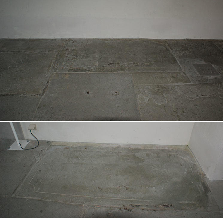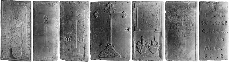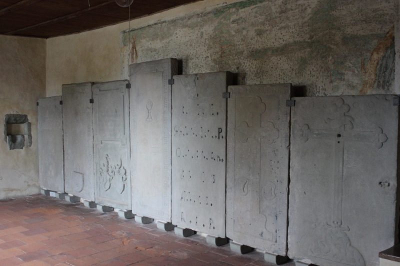 An der linken Nordwand der Vorhalle sind sieben Grabplatten angebracht. Die Platten aus Molassesandstein (einer Form von Sedimentgestein) wurden erst bei der letzten Restaurierung 1984 in ihrer heutigen Position aufgestellt – hinterlüftet und statisch verklammert. Sie verdecken nun eine dunkel umrahmte Landschaftsdarstellung des 15. Jahrhunderts, die ursprünglich als Hintergrund für eine ... mehr anzeigenAn der linken Nordwand der Vorhalle sind sieben Grabplatten angebracht. Die Platten aus Molassesandstein (einer Form von Sedimentgestein) wurden erst bei der letzten Restaurierung 1984 in ihrer heutigen Position aufgestellt – hinterlüftet und statisch verklammert. Sie verdecken nun eine dunkel umrahmte Landschaftsdarstellung des 15. Jahrhunderts, die ursprünglich als Hintergrund für eine Ölberg-Szene diente. Die Holzskulpturen befinden sich seit dem 18. Jahrhundert im Innenraum, im linken Seitenschiff der Kirche.Die Grabplatten erinnern an Kleriker, die in der Kirche gewirkt haben, aber auch an eine Adlige, die die Kirche vermutlich mit Stiftungen bedacht hat; die letzte der Platten gibt jedoch nicht Preis für wen sie bestimmt war. Die Denkmäler stammen aus dem 15. bis 18. Jahrhundert, sind jedoch nicht in chronologischer Reihenfolge platziert, sondern nach Größe sortiert: die größte Platte in der Mitte wird flankiert von nach außen treppenförmig absteigenden Platten. Ihr ursprünglicher Platz ist ungeklärt. Man kann jedoch annehmen, dass alle, bis auf eine Ausnahme, als Bodenplatten eingesetzt waren, wofür auch diverse Gebrauchsspuren sprechen. Im südlichen Seitenschiff sind Grabplatten nach Absenkung des Bodenniveaus in situ wiederverwendet worden.