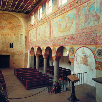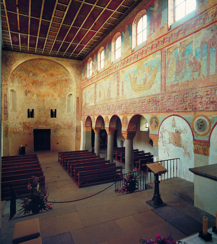 Das Mittelschiff ist mit den Seitenschiffen jeweils durch vier echte, offene Arkaden verbunden. Sie ruhen auf Säulen aus verputztem Kalksandstein. An den Mauerzungen im Osten und Westen wird die Architekturgliederung mit Mitteln der Malerei fortgesetzt. Trotz statischer Probleme kann so das geschlossene Bild einer Säulenbasilika vermittelt werden. Die Fortführung der Säulen am östlichen Triumphbogen sind allerdings ein Werk des 19. Jahrhunderts.