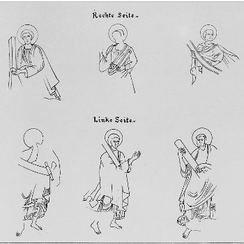 Im Zuge der Neugestaltung der Obergadenzone orientierte sich Schilling an dieser Zeichnung der fragmentarisch erhaltenen Aposteldarstellungen. Franz Baer, ein Architekt des Erzbischöflichen Bauamtes in Freiburg, fertigte sie vor 1884 an.