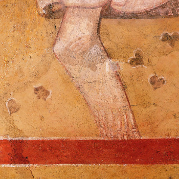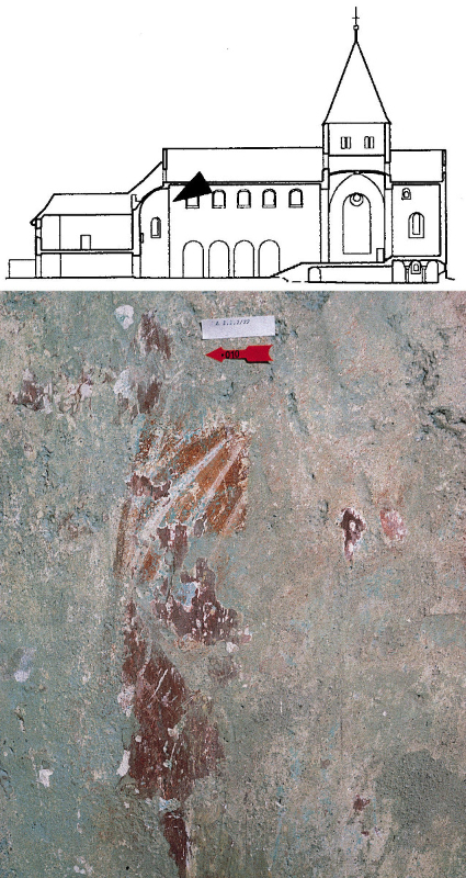 Zwischen dem 5. Apostel von Westen auf der Mittelschiffnordwand und dem östlich danebenliegenden Fenster steht der Ausmalung Schillings aus dem 19. Jahrhundert ein Fragment der ersten Ausmalung gegenüber. Es handelt sich um einen figürlichen Gewandrest, der punktuell einen Nachweis für die erste Ausmalung der Obergadenzone erbringt.