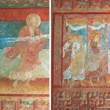 mehr anzeigenWer die Aposteldarstellungen im Obergaden oder aber den Wunderzyklus darunter betrachtet, stellt fest: Die Apostel sind ein wichtiger Bestandteil beider Bereiche der Wandgestaltung. Mit Überlegungen des Kunsthistorikers Wolfgang Kemp zu christlichen Bildsystemen können wir dieses doppelte Auftreten besser verstehen.Im Obergaden sind die Apostel Teil einer quasi himmlischen Ordnung: sie bezeugen als überzeitliche Figuren die Wahrheit des ganzen Bildprogramms. Im Wunderzyklus werden sie dagegen als historische Figuren zu Zeugen der Taten Christi. Obwohl man es umgekehrt erwarten könnte, erscheinen sie als historische Figuren eher statisch, als überzeitliche Figuren hingegen bewegter.
