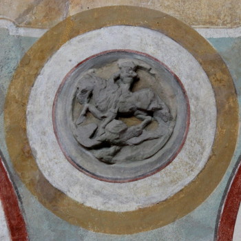Nur noch schemenhaft kann man im runden Bildwerk erkennen, wie der heilige Georg auf seinem Pferd sitzt und im Begriff ist, einen Drachen zu töten. Der anonyme Bericht aus dem Jahr 1879 beschreibt die Entdeckung so: