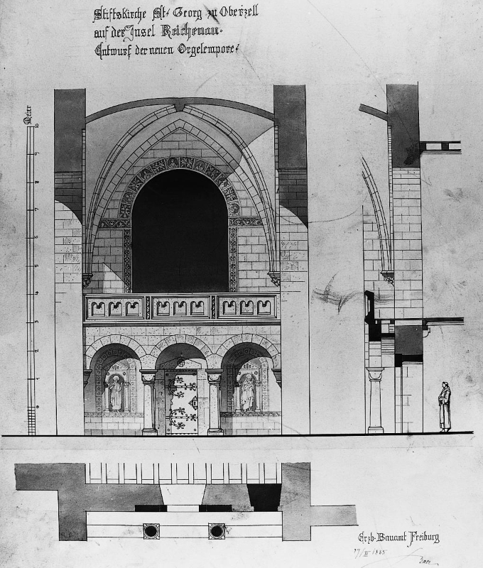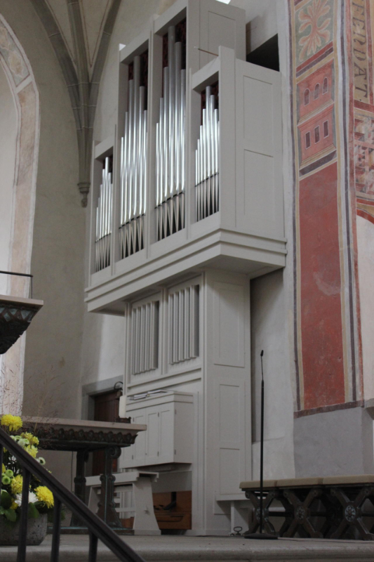 mehr anzeigenDie an der Südwand der Vierung angebrachte Orgel wurde 1985 von der Überlinger Orgelbaufirma "Mönch und Söhne" gebaut und am 16. August 1987 eingeweiht. Die Orgel enthält 19 klingende Register, 2 Pedaltransmissionen, sowie 1106 Pfeifen aus Zinn-Legierungen und Holz, die zu 80 Prozent aus der Vorgängerorgel stammen.Über 60 Jahre lang herrschte in St. Georg ein regelrechter „Orgelkrieg“, der mit Entdeckung des Wandmalereizyklus im Langhaus 1879 begann. Damals war es das Ziel, den Betrachter gefühlt in die frisch erbaute Kirche zurückzuversetzen und so musste man die Orgelempore in der Westapsis als Fremdkörper empfinden. Sie wurde 1890 abgebrochen und die Orgel zunächst eingelagert. Es folgte ein 60 Jahre dauernder Disput über einen geeigneten Standort und eine angemessene Ausführung, an dem Vertreter der Kirche, der Denkmalpflege, Orgelbauer, Bauämter und andere Experten beteiligt waren. Von Beginn an stellte der Wunsch nach einer Sängerempore das größte Problem dar, da dies umfassende bauliche Eingriffe mit sich geführt hätte. Erst in den 1950er Jahren wurden Teile der Vierungssüdwand für ein Emporengehäuse mit provisorischer Orgel entfernt. 1987 wurde die heutige Orgel eingebaut. Auf eine Sängerempore wurde verzichtet und die Orgel vor die Südwand der Vierung gestellt. weniger anzeigen