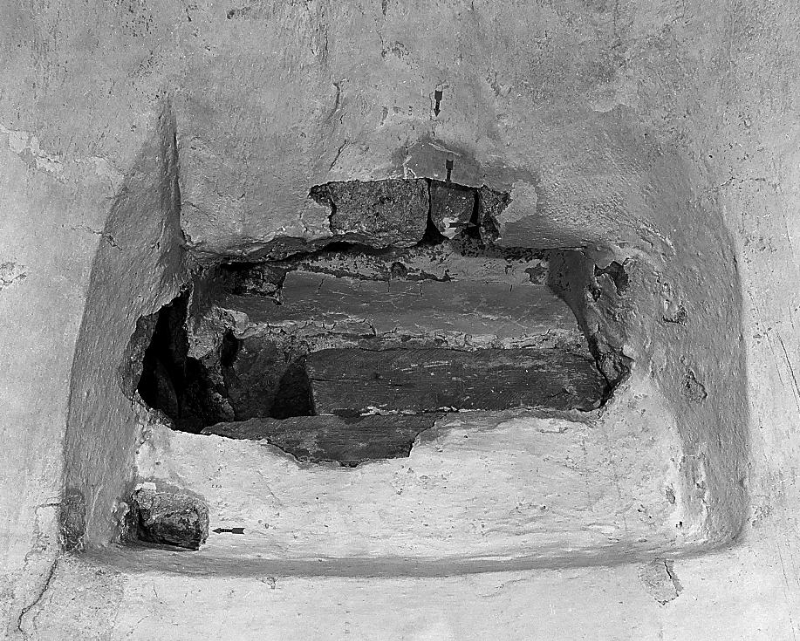 Auf Scheitelhöhe des Zugangsstollens sind rechts und links zwei Findlinge in das Mauerwerk eingelassen. Zusammen mit ausgebesserten Fehlstellen im Mörtel deuten sie darauf hin, dass es vor Verlegung der Reliquie eine Vorrichtung, beispielsweise eine Gittertür, zur Verschließung des Stollenzugangs gegeben hat. weniger anzeigen
