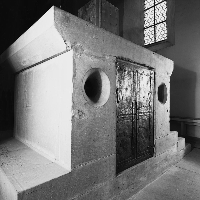 Im 14. Jahrhundert wurde der Hochalter nach hinten versetzt und die Reliquien hinter schweren Eisentüren und Oculi in den Altar verlagert. Das Zentrum der Kirche verlagerte sich somit in den Bereich des Chores, hinter den Lettner und war nicht mehr zwischen Chor und Krypta in einem Übergang zwischen oben und unten angelegt.
