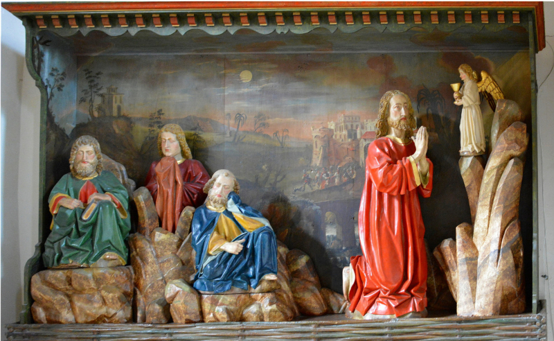 Die Ölbergszene wird in einem Holzkasten präsentiert, in dem plastische Figuren vor einem gemalten Hintergrund angeordnet sind. Zu der Ölberggruppe gehören drei jeweils etwa einen Meter große Jünger-Figuren (Petrus, Jakobus und Johannes). Sie sind heute in der linken Bildhälfte frontal zur Öffnung der Bühne platziert. Die Männer sitzen auf Steinbrocken in ruhender Haltung eng ... mehr anzeigenDie Ölbergszene wird in einem Holzkasten präsentiert, in dem plastische Figuren vor einem gemalten Hintergrund angeordnet sind. Zu der Ölberggruppe gehören drei jeweils etwa einen Meter große Jünger-Figuren (Petrus, Jakobus und Johannes). Sie sind heute in der linken Bildhälfte frontal zur Öffnung der Bühne platziert. Die Männer sitzen auf Steinbrocken in ruhender Haltung eng beieinander. Die Augen sind geschlossen und die zwei rechten Jünger (Jakobus und Johannes) stützen ihren Kopf. Der linke Jünger (Petrus) ruht in sich, mit einem Buch in der Hand. Klar getrennt von ihnen kniet eine lebensgroße Christus-Figur in der rechten Bildhälfte. Jesus ist von den Jüngern abgewandt und nur leicht aus dem Profil in Richtung der Bühnenöffnung gedreht. Seine Hände sind zum Gebet zusammengelegt. Ganz rechts steht ein Engel auf einem weiteren Felsen. Der Hintergrund ist aus drei bemalten Holztafeln zusammengesetzt, welche die Häscher beim Auszug aus Jerusalem zeigen.Zeitlich wird die Gruppe in die Spätgotik, also Ende des 15. Jahrhunderts eingeordnet, wobei die Hintergrundkulisse erst 1787 und der Holzkasten im Jahr 1894 entstanden sind. Auch der kleine Engel ist aufgrund seiner Stilmerkmale eher dem 18. Jahrhundert zuzuordnen. Von den sieben Felsstücken stammt nur eines aus dem 15. Jahrhundert. Die anderen sechs sind im Laufe des 20. Jahrhunderts ergänzt oder überarbeitet worden. Auch die Farbfassung der Figuren wurde zuletzt im 20. Jahrhundert erneuert.