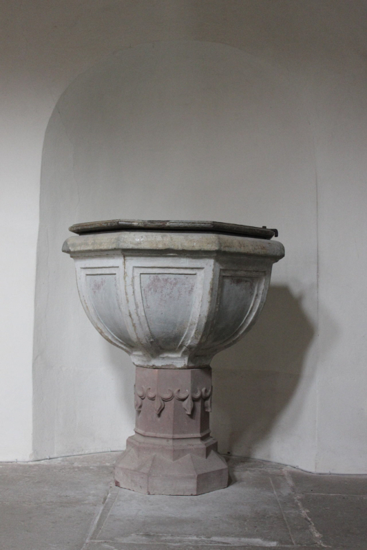 Der spätgotische Taufstein befand sich bis 1880 im südlichen Seitenschiff. Auf dem schlanken Steinsockel ruht der achteckige, rundum mit Kassetten verzierte Taufstein. Oben verschließt ihn eine Abdeckung aus Holz. An der heutigen Position war ursprünglich ein Seiteneingang, der dann zugemauert und zur Taufnische umgebaut wurde. Dort fand die Skulptur ihren neuen Platz. 1895 erhielt der Stein von Adolf Kiesel, einem Steinhauermeister in Freiburg einen neuen Sockel aus rotem Sandstein. Direkt unter dem Becken befindet sich eine der eingelassenen Grabplatten.