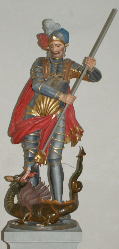 In der Kirche St. Georg muss man suchen, um ein Bild des Namenspatrons zu finden. Die 1,65m große ¾-Skulptur aus Lindenholz, die heute in der südlichen Seitenschiffapsis steht, hält einen Speer in den Händen und ist im Begriff, den unter ihr befindlichen Drachen mit einem Stoß in den Rachen zu töten. Die Dynamik der Szene greift noch etwas zaghaft auf den wallenden Mantel über, was ... mehr anzeigenIn der Kirche St. Georg muss man suchen, um ein Bild des Namenspatrons zu finden. Die 1,65m große ¾-Skulptur aus Lindenholz, die heute in der südlichen Seitenschiffapsis steht, hält einen Speer in den Händen und ist im Begriff, den unter ihr befindlichen Drachen mit einem Stoß in den Rachen zu töten. Die Dynamik der Szene greift noch etwas zaghaft auf den wallenden Mantel über, was auf eine Entstehung im Frühbarock verweist.