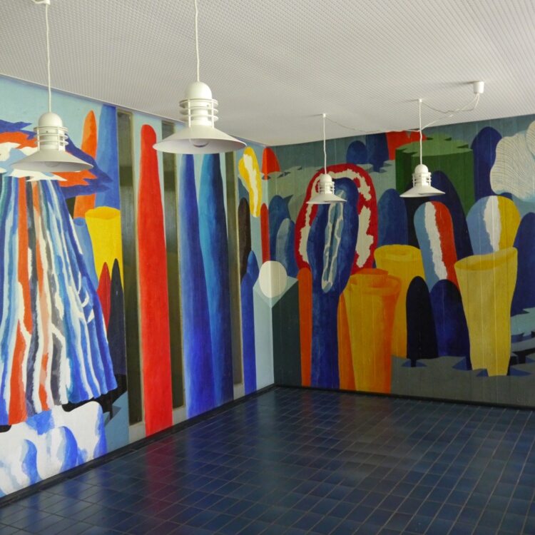 Nur nach Anmeldung beim Empfang während den Bürozeiten zugänglichDas ausgreifende Werk bedeckt drei Wände des Gemeinschaftsraums im Vermögens- und Hochbauamt in Egg vollständig vom Boden bis zur Decke. Auf der einen Seite grenzt die Malerei an eine Fensterfront, auf der anderen an eine Tür. Die mittlere Wand wird durch vier Glasfenster durchbrochen, die einen Blick in den benachbarten Raum zulassen. Einfache, abstrakte Formen in kräftigen Farben, – ... mehr anzeigenDas ausgreifende Werk bedeckt drei Wände des Gemeinschaftsraums im Vermögens- und Hochbauamt in Egg vollständig vom Boden bis zur Decke. Auf der einen Seite grenzt die Malerei an eine Fensterfront, auf der anderen an eine Tür. Die mittlere Wand wird durch vier Glasfenster durchbrochen, die einen Blick in den benachbarten Raum zulassen. Einfache, abstrakte Formen in kräftigen Farben, – neben Weiß und Schwarz die Primärfarben Rot, Gelb, Blau – bestimmen den Gesamteindruck. Die Formen sind meist aufrecht stehende, stelenartige Gebilde. Es sind Kunstfiguren, die eine abstrakte Welt der Malerei bevölkern. Bisweilen wird die geometrische Formgebung betont; bisweilen entstehen durch eine freiere Gestaltung Assoziationen zu landschaftlichen Motiven, zu Objekten und Figuren der Lebenswelt. Wolfgang Glöckler, 1941 in Konstanz geboren, ist Maler, Keramik-Künstler und Bildhauer. Nach einer Lehre als Musterzeichner in der Textilindustrie studierte er Malerei an der Staatlichen Akademie der Bildenden Künste in Karlsruhe. 1996 zog Glöckler nach Frankreich und lebt dort in La Broche nahe den Vogesen. Seit 1999 signiert er seine Werke nicht mehr mit dem Namen Wolfgang Glöckler sondern mit Atalanta Lorraine. weniger anzeigen