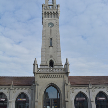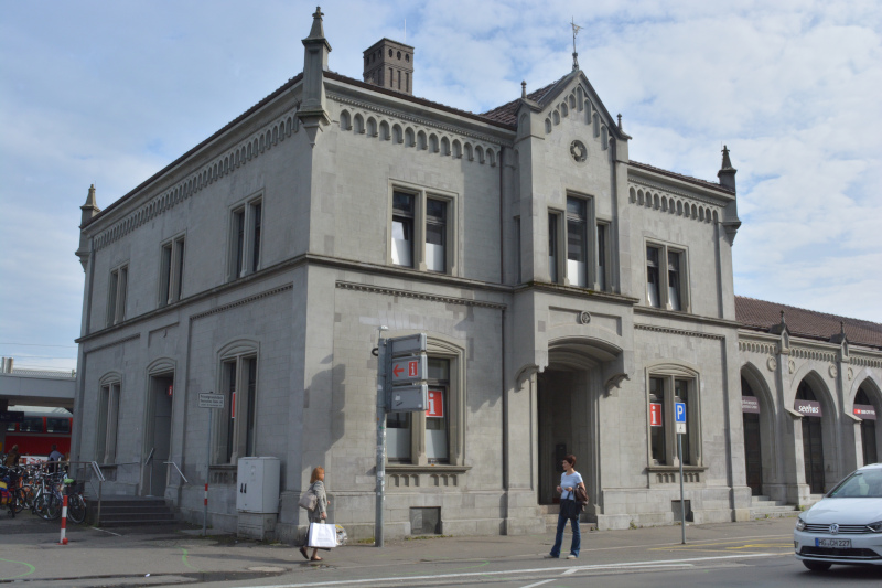 Im 19. Jahrhundert waren in den quadratischen Bauten im Norden und im Süden des Bahnhofskomplexes Büros und Betriebswohnungen untergebracht. Ihr äußeres Erscheinungsbild wird maßgeblich durch eine glatte und werksteinsichtige Rustika aus Sandstein geprägt. Ein umlaufendes Kranzgesims strukturiert die Fassade in Erd- und Obergeschoss. Die Westseite des Erdgeschosses verfügt über zweibahnige Fenster mit angedeuteten Korbbögen und kleinen Zierbalustraden. Der zentral positionierte Eingang wird von einem Erker mit Spitzgiebel und dreibahnigem Fenster im Obergeschoss des Gebäudes überdacht. Begrenzt werden die Fassadenseiten durch glatte Eckrustiken, an deren oberem Ende sich kleine, für die Epoche der Gotik typische, Türmchen befinden. Ein Kranzgesims mit Rundbogenfries sowie ein flaches Walmdach mit geziegeltem Schornstein bilden den Abschluss des Baukörpers.