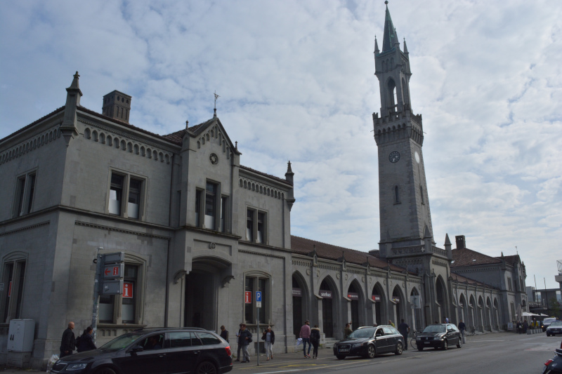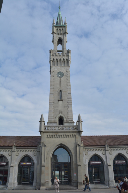 Entsprechend des im 19. Jahrhunderts vorherrschenden Historismus, der auf frühere Epochenstile zurückgreift und einzelne Elemente der Formensprache in die Zeit des 19. Jahrhunderts überträgt, verwendeten die Bauherren bei der Gestaltung der Fassade des Bahnhofs Konstanz gotische Gestaltungselemente wie Spitzbögen, zierenden Türmchen oder ein angedeutetes Strebewerk. Im Vergleich mit anderen Bauwerken aus der Epoche der Gotik (12. bis 16. Jahrhundert) wird hier allerdings die Wand als tragendes System nicht systematisiert und maximal aufgelöst, die Vertikale wird nicht betont und sogar einzelne Bauelemente aus der Renaissance fließen in die Gestaltung ein. Auch das vorgeblendete Strebewerk vor der Arkadenhalle dient nicht mehr der Statik, sondern rein dekorativen Zwecken.