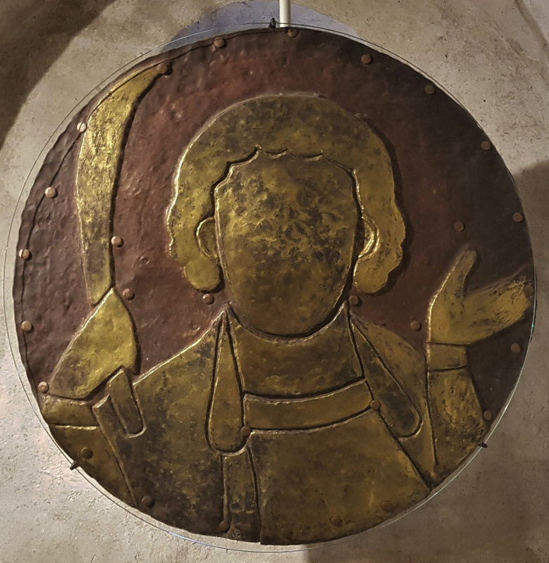 Die Pelagiusscheibe hat einen Durchmesser von ca. 97 cm, leider ging die Innenzeichnung des Gesichts verloren. Es bestand wohl aus Email brun und war der Gestaltung des Konrad ähnlich. St. Pelagius, ein Märtyrer, hält in seiner rechten Hand einen Palmzweig, die Linke ist betend erhoben.