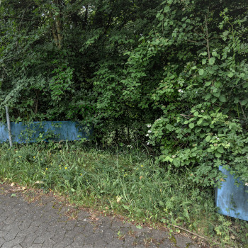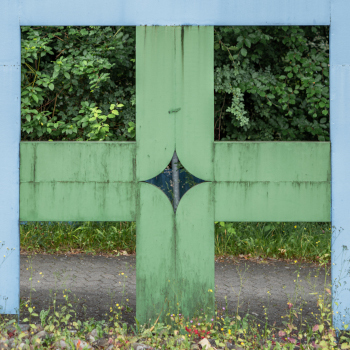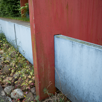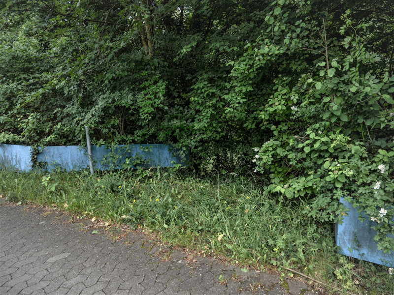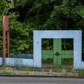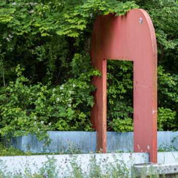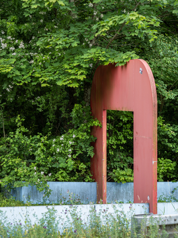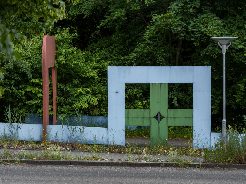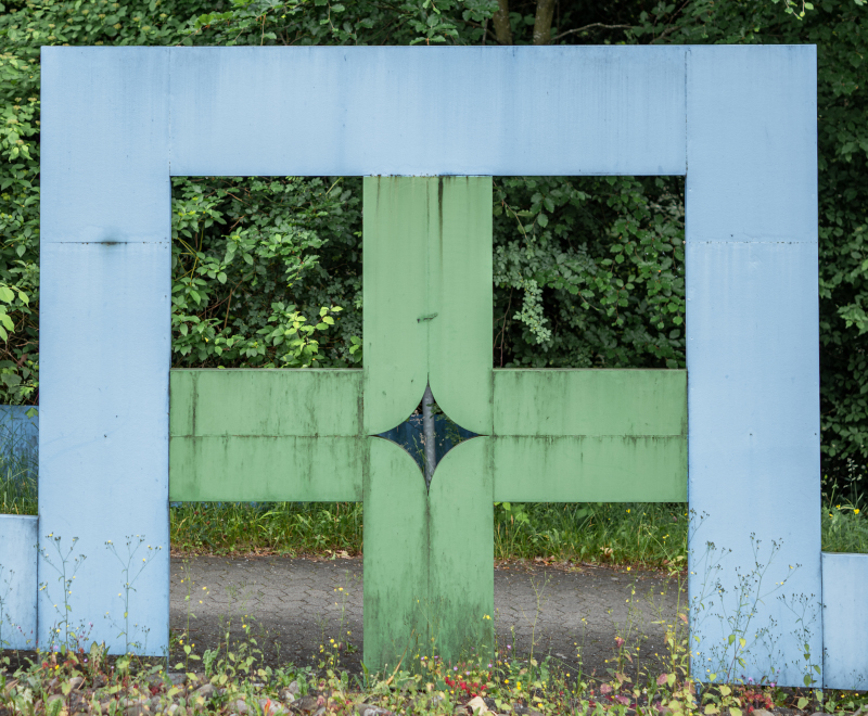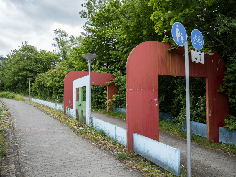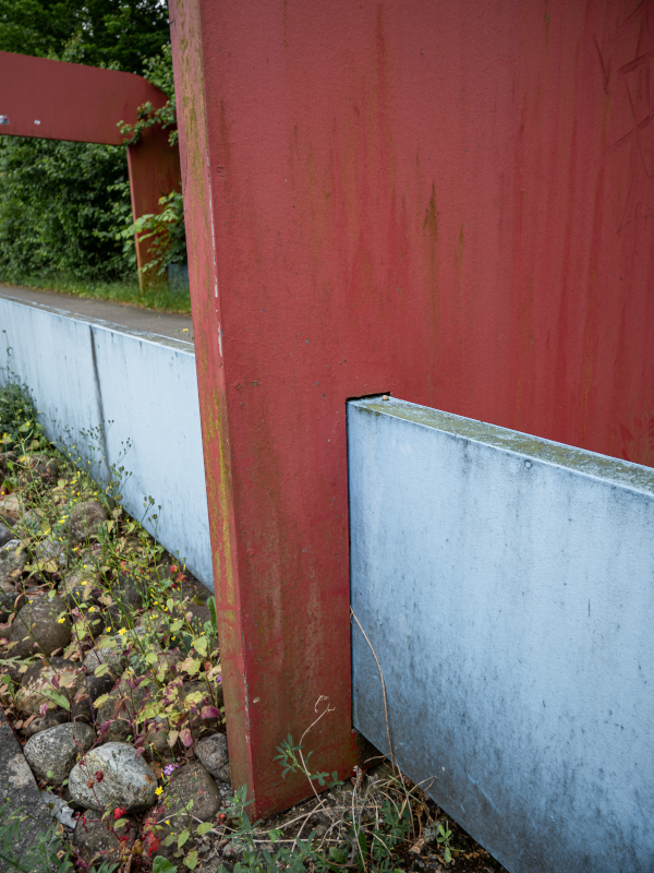 Das Ensemble verliert durch die fehlende Fußgängerbrücke an Prominenz und rückt in den Schatten der Böschung am Wegesrand. Diese unmittelbare Nähe zur Natur hinterlässt Spuren auf dem Stahl und der Farbe, die durch die Witterung an Strahlkraft verloren hat. Im Sommer verschwindet der eine Teil fast komplett im Gebüsch, nichtsdestotrotz begrüßt und verabschiedet die Skulptur täglich Menschen auf ihrem Weg.