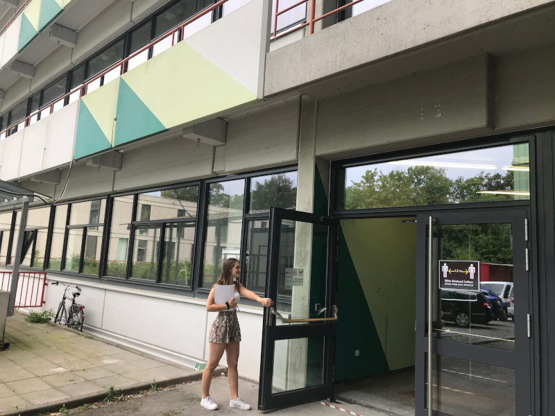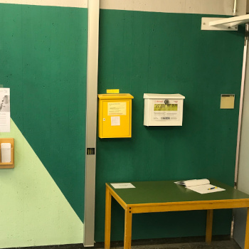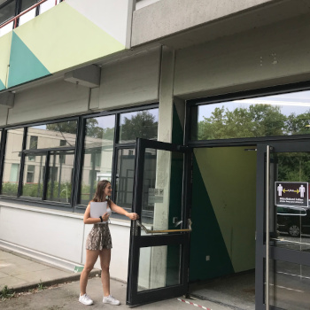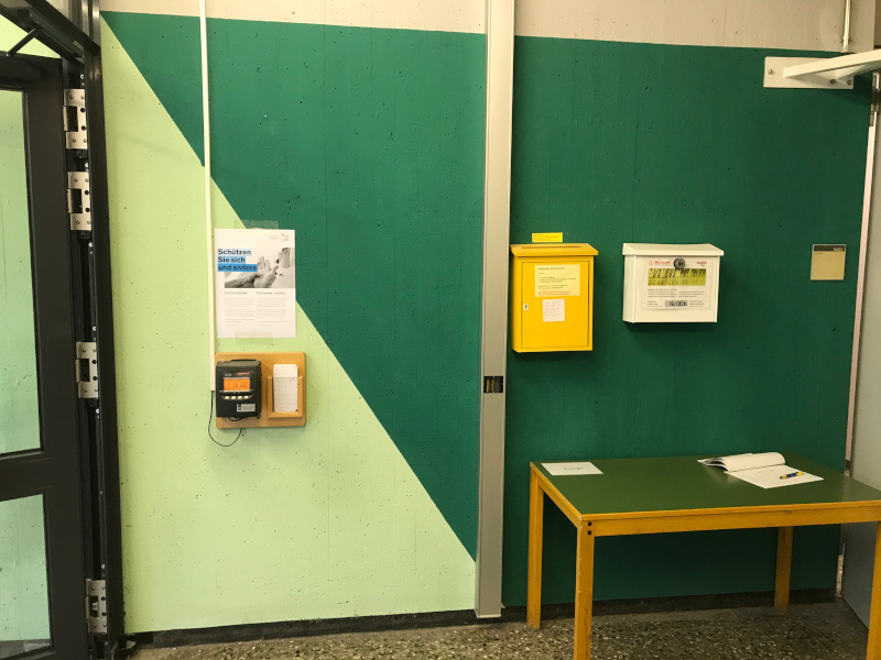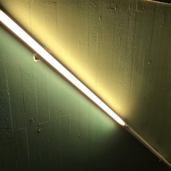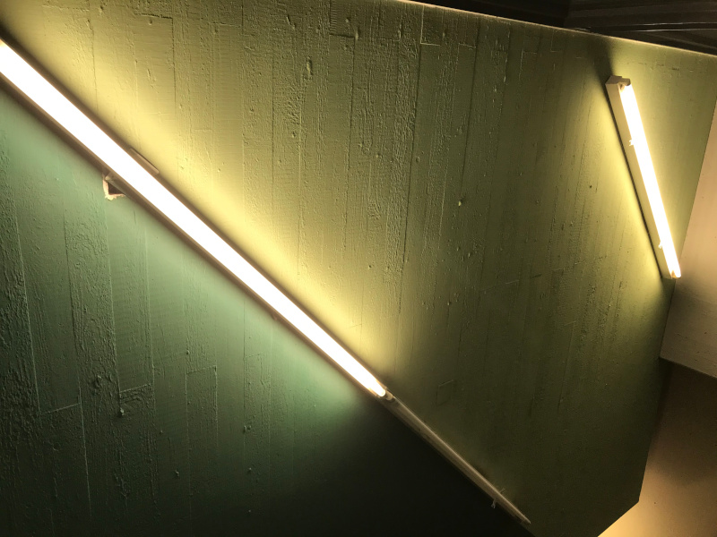 Für Betrachter*innen zunächst von außen nicht sichtbar führte Riel sein Kunstwerk im Innenbereich des Gebäudes weiter. Betritt man den Eingang M6, steht man unmittelbar neben einer großen Wand, die mit zwei Dreiecken in unterschiedlichen Grüntönen komplett bedeckt ist. Sieht man nach oben an die Decke, erkennt man wie dort ebenfalls das „Dreieckmuster“ weitergeführt und die Farbigkeit durch lange, intensiv leuchtende Neonröhren verstärkt wurde, die eine Art Lichtspiel erzeugen. Durch das Betreten des Innenraums nehmen die Betrachter*innen das Kunstwerk anders wahr und können es zu einem Gesamtwerk zusammensetzen.