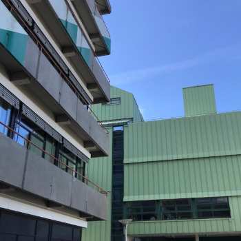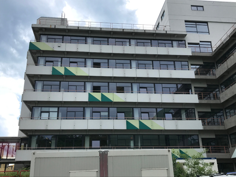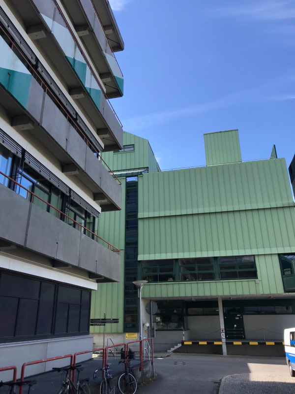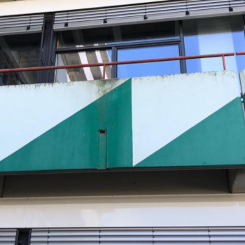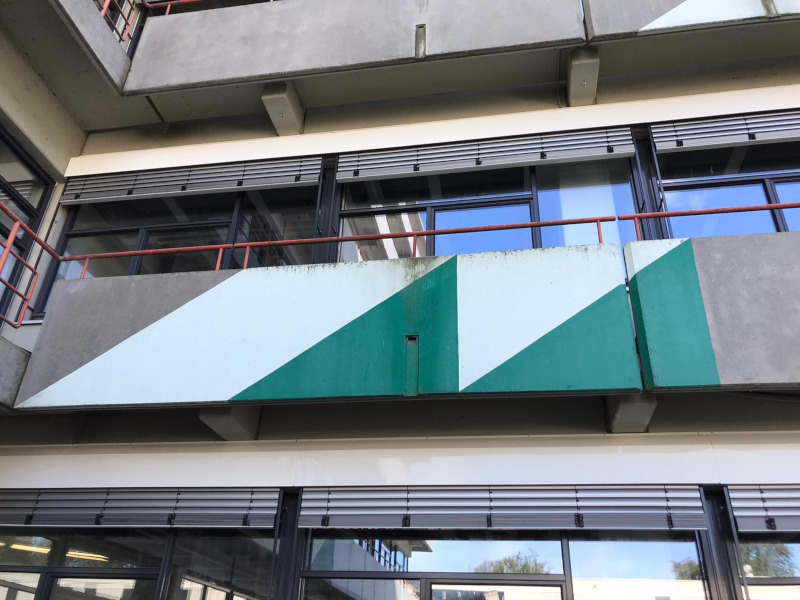 Etwas versteckt im hinteren Teil der Universität am Chemiegebäude M findet man die Fassadenbemalung „Ohne Titel“ von Gert Riel. Steht man vor dem Gebäude, fällt einem sofort die diagonale Anordnung der Bemalung (Acrylfarbe) auf: Dreiecke ziehen sich über fünf Ebenen von unten nach oben entlang der Fassade diagonal in die Höhe und werden von Fensterreihen regelmäßig unterbrochen. ... mehr anzeigenEtwas versteckt im hinteren Teil der Universität am Chemiegebäude M findet man die Fassadenbemalung „Ohne Titel“ von Gert Riel. Steht man vor dem Gebäude, fällt einem sofort die diagonale Anordnung der Bemalung (Acrylfarbe) auf: Dreiecke ziehen sich über fünf Ebenen von unten nach oben entlang der Fassade diagonal in die Höhe und werden von Fensterreihen regelmäßig unterbrochen. Da das Farbband auf zwei Gebäudehälften, die im rechten Winkel zueinanderstehen, symmetrisch angeordnet ist, erhält das Kunstwerk eine „V“-Ansicht.Riel benutzte verschiedene Grün- und Weißtöne für die Bemalung, ein Farbkonzept, das sich auch an einigen umliegenden Gebäudeteilen finden lässt. Auf ein grünes ist jeweils ein helles Dreieck in umgekehrter Form gesetzt, sodass sich optisch ein Viereck ergibt. Pro Reihe sind fünf Dreiecke zu erkennen – ausgenommen die oberste Reihe, die mit drei Dreiecken auslaufend abschließt.