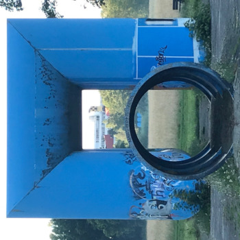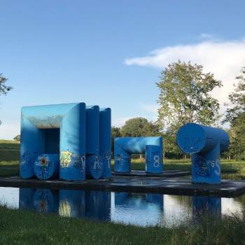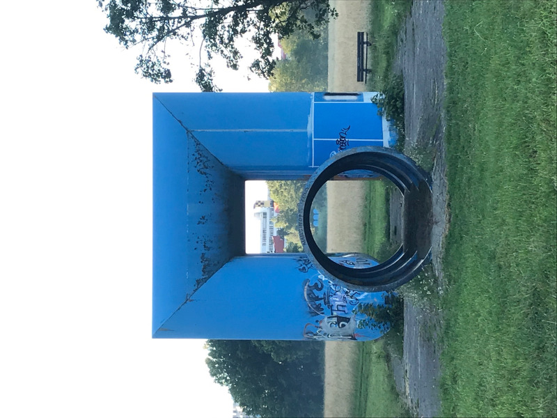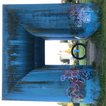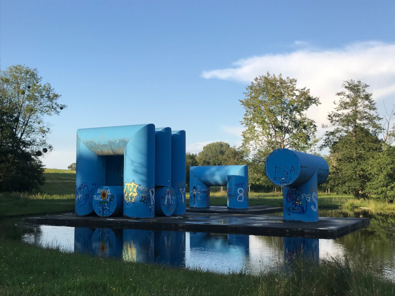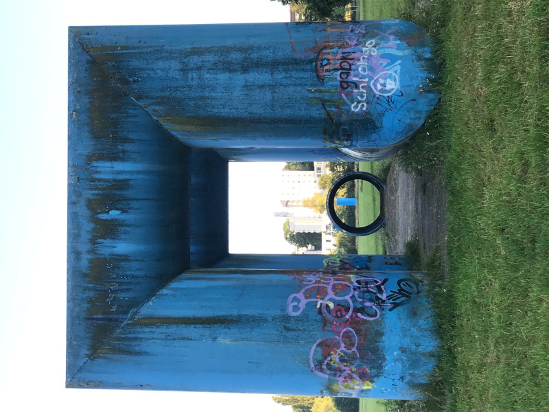mehr anzeigenDie 1975 errichtete Röhrenlandschaft des Künstlers Friedrich Gräsel im Konstanzer Hockgraben impliziert die landschaftliche Verbindung zwischen den sich gegenüberliegenden Anhöhen des Studierendenwohnheims Sonnenbühl und der Universität, wodurch die Betrachter*innen visuell und physisch gelenkt wird.Insgesamt erstreckt sich das Kunstwerk geradlinig über 600 Meter und besteht aus leuchtend blauen Röhrenplastiken aus Kunststoff, die sich über drei Stationen hinweg aufeinander beziehen und in ihrer Intensität steigern. Dies geschieht durch die unterschiedliche Einbeziehung der Betrachter*innen, die von Station zu Station das Werk besser erforschen können. Vom Studierendenwohnheim am Sonnenbühl ausgehend beginnt das Kunstwerk mit einer alleinstehenden Säule, die mit ihrem hellen Fundament über einer unterirdischen Ferndampfleitung steht. Weiter in der Blickachse gelangt man zur zweiten Station, an welcher die Röhren, die einen Durchmesser von 2 Metern und eine Höhe von 6 Metern besitzen, zu einem doppelten Tor und einem Tunnel geformt sind.