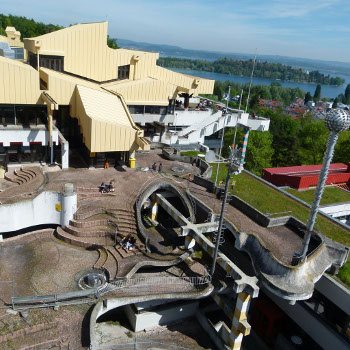 Eugen Schneble gestaltete den Innenhof der Universität Konstanz so, dass er als Herzstück fungiert, das Mensa, Bibliothek und Eingangsbereich miteinander verbindet. Das Werk besteht aus Terrassen- und Balkonelementen sowie Balustraden, die auf mehreren Ebenen ineinander übergehen und durch Treppen verbunden sind. Der Boden aus rötlichem Pflasterstein scheint sich aufzuschichten und zu ... mehr anzeigenEugen Schneble gestaltete den Innenhof der Universität Konstanz so, dass er als Herzstück fungiert, das Mensa, Bibliothek und Eingangsbereich miteinander verbindet. Das Werk besteht aus Terrassen- und Balkonelementen sowie Balustraden, die auf mehreren Ebenen ineinander übergehen und durch Treppen verbunden sind. Der Boden aus rötlichem Pflasterstein scheint sich aufzuschichten und zu wölben wie organisches Material. Weißgelb bemalte Stützpfeiler durchbrechen die geschwungenen Formen. Im Innenhof befindet sich das Ensemble mit mehreren Objekten von Otto Piene, die Schneble über Wasserläufe mit dem Innenhof des Philosophikums und Klaus Arnolds Brunnenformen verband. Die beste Sicht auf Schnebles Werk hat man von der Dachterrasse der Ebene B 09 aus.