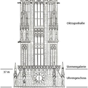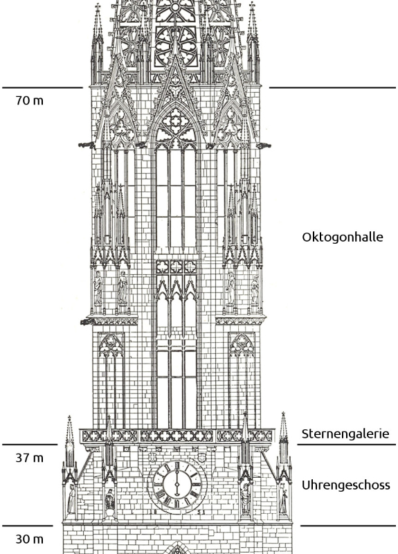 • Abb. 1 von 2 - Bildquelle: Aufriss entnommen aus: Freiburger Münsterblätter (Hrsg. Münsterbauverein Freiburg i. Br.), 3. Jahrgang 1907, 1. Heft, S. 12 (Ausschnitt), eigene Einzeichnungen