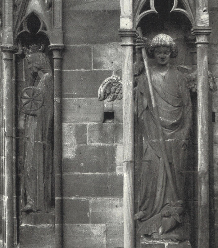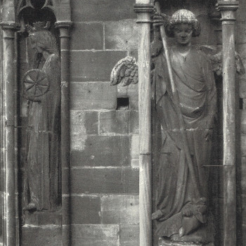 • Von links nach rechts sind hier die heilige Katharina, der Erzengel Michael und Kaiser Heinrich zu sehen. Alle drei Figuren befinden sich am Westturm auf Höhe des Uhrengeschosses. Die Figuren mussten wegen ihrer Größe aus zwei Steinblöcken gefertigt werden. Die Stelle, wo die Blöcke aufeinandergesetzt wurden, erkannt man bei allen drei Figuren sehr gut. Die heilige Katharina trägt als Märtyrerin Palmwedel und Rad, der Erzengel Michael bekämpft mit der Lanze den Drachen, während Kaiser Heinrich mit Krone und Stab ausgestattet ist.