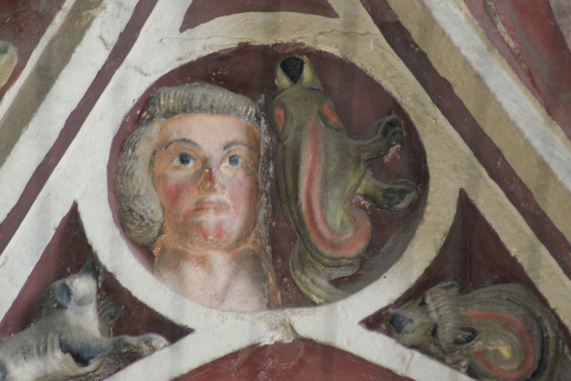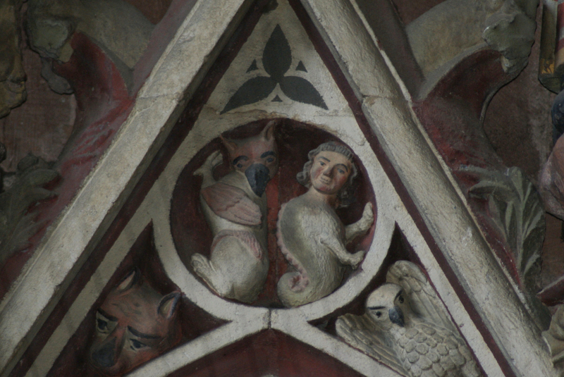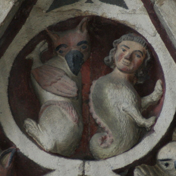 Die rechte Figur scheint ein Seepferdchen zu sein, besitzt jedoch einen menschlichen Kopf. Die Figur daneben hat den Oberkörper eines Vogels und den Unterkörper einer Raubkatze. Beide Figuren blicken hinunter auf den Betrachter.