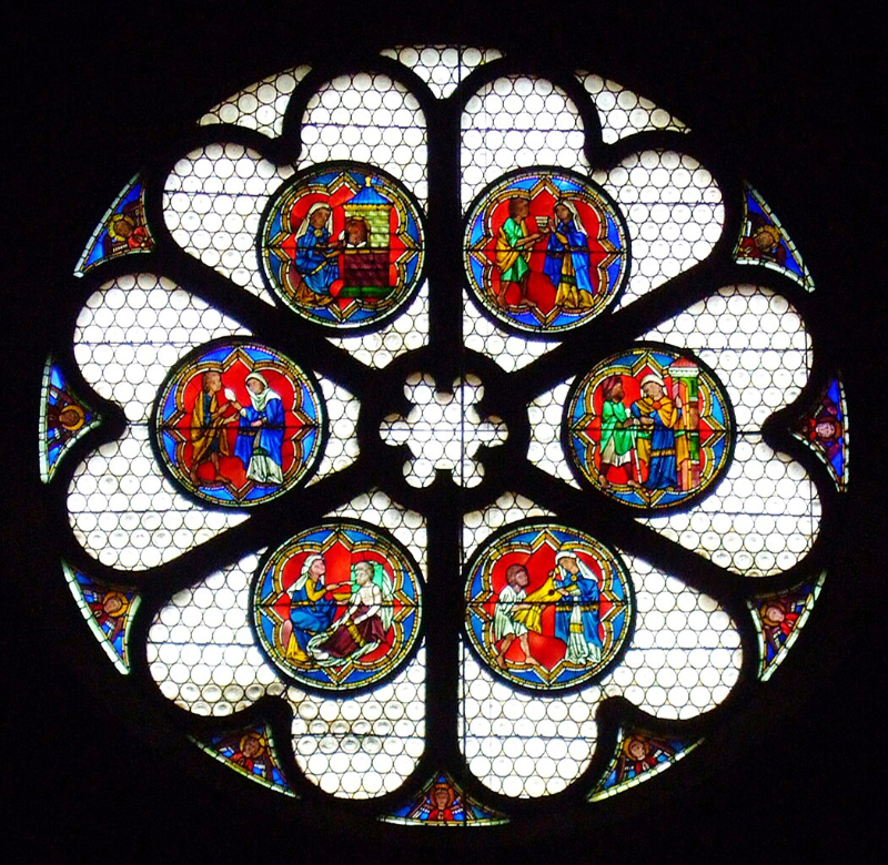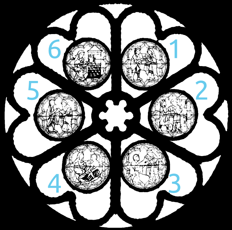 Das Fenster ist um 1250/60 entstanden. In sechs herzförmigen Kompartimenten befindet sich jeweils eine Szene der Barmherzigkeit. Die Medaillons haben einen blauen Hintergrund. Die Taten der Barmherzigkeit sind in einem gezackten Vierpass gerahmt und vor rotem Grund dargestellt.Alle Taten werden von einer vornehm gekleideten Frau ausgeführt, die einem Mann ihre Barmherzigkeit zuteilwerden ...